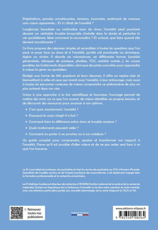 Rédigé sous forme de 100 questions et leurs réponses, il offre un repère clair et bienveillant à celles et ceux qui vivent avec l’anxiété, à leur entourage, mais aussi à toutes les personnes curieuses de mieux comprendre ce phénomène de plus en plus présent dans nos vies. Grâce à une approche à la fois scientifique et humaine, l’ouvrage permet de mettre des mots sur ce que l’on ressent, de mieux identifier ses propres besoins, et de découvrir des ressources pour avancer à son rythme.