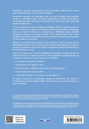 Ce livre propose des réponses simples et accessibles à toutes les questions que l’on peut se poser face au stress et à l’anxiété, qu’elle soit ponctuelle ou chronique, légère ou sévère. Il aborde ses mécanismes, ses différentes formes (anxiété généralisée, attaques de panique, phobies, TOC, anxiété sociale...), les causes possibles, les traitements disponibles, ainsi que des pistes concrètes pour apprendre à mieux la gérer au quotidien.