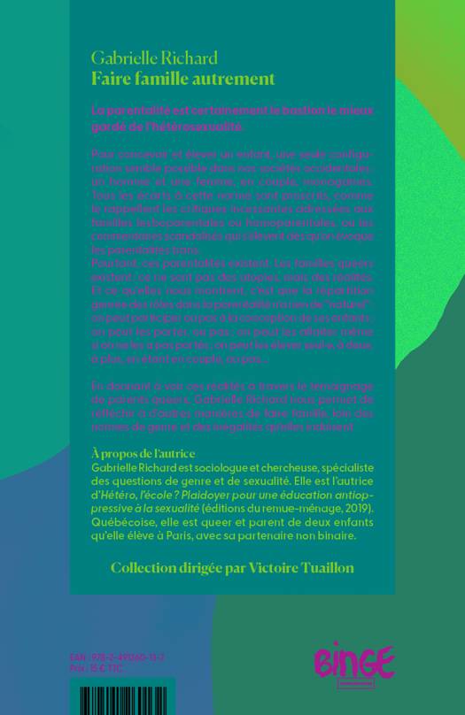 Pour concevoir et élever un enfant, une seule configuration semble possible dans nos sociétés occidentales : un homme et une femme, en couple, monogames. Tous les écarts à cette norme sont proscrits, comme le rappellent les critiques incessantes adressées aux familles lesboparentales ou homoparentales, ou les commentaires scandalisés qui s’élèvent dès qu’on évoque les parentalités trans. Pourtant, ces parentalités existent. Les familles queers existent : ce ne sont pas des utopies, mais des réalités. Et ce qu’elles nous montrent, c’est que la répartition genrée des rôles dans la parentalité n’a rien de « naturel » : on peut participer ou pas à la conception de ses enfants ; on peut les porter, ou pas ; on peut les allaiter même si on ne les a pas portés ; on peut les élever seul·e, à deux, à plus, en étant en couple, ou pas... En donnant à voir ces réalités à travers le témoignage de parents queers, Gabrielle Richard nous permet de réfléchir à d’autres manières de faire famille, loin des normes de genre et des inégalités qu’elles induisent.