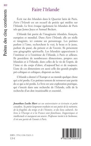 Écrit rue des Irlandais dans le Quartier latin de Paris, Faire l'Irlande est un recueil de poésie qui médite sur l'Irlande. Le livre comprend également les Irlandais de Paris tels que James Joyce et Samuel Beckett. L'Irlande fait partie de l'imaginaire irlandais, français, européen et mondial. L'Irlande dans Faire l'Irlande est réelle et imaginée ici, un personnage. Les poèmes parlent à l'âme, recherchent le vrai, le beau et le juste, parlent du passé, du présent et de l'avenir C'est une collection de géographie spirituelle. Ici, les Irlandais apparaissent à l'intérieur et à l'extérieur de l'Irlande, à Paris et ailleurs. Il y a de nombreuses dimensions aux Irlandais et à l'Irlande dans la vie de l'esprit, de l'esprit et du corps d'alors, d'aujourd'hui et d'aujourd'hui. L'une de ces dimensions, les grands peuples pré-celtiques et celtiques, dispersés au loin. L'Irlande a donné à l'Europe et au monde quelque chose qui a été perdu. Ces poèmes tentent de retrouver une partie de ce qui a été perdu. Le livre est une exploration poétique, qui s'inscrit dans une partie d'une recherche de l'Irlande, la recherche d'un don insaisissable et essentiel.