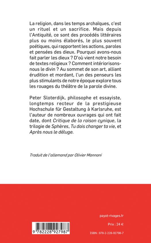 La religion, dans les temps archaïques, c'est un rituel et un sacrifice. Mais depuis l'Antiquité, ce sont des procédés littéraires plus ou moins élaborés, le plus souvent poétiques, qui rapportent les actions, paroles et pensées des dieux. Pourquoi avons-nous fait parler les dieux ? D'où vient notre besoin de textes religieux ? Comment intériorisons-nous le divin ? Au sommet de son art, alliant érudition et mordant, l'un des penseurs les plus stimulants de notre époque explore tous les rouages du théâtre de la parole divine.