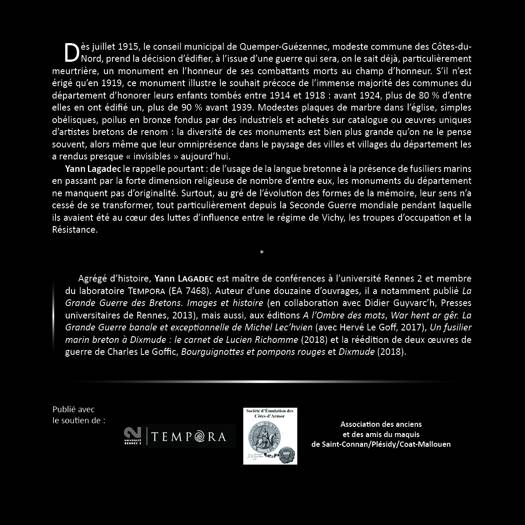 Dès juillet 1915, le conseil municipal de Quemper-Guézennec, modeste commune des Côtes-du-Nord, prend la décision d’édifier, à l’issue d’une guerre qui sera, on le sait déjà, particulièrement meurtrière, un monument en l’honneur de ses combattants morts au champ d’honneur. S’il n’est érigé qu’en 1919, ce monument illustre le souhait précoce de l’immense majorité des communes du département d’honorer leurs enfants tombés entre 1914 et 1918 : avant 1924, plus de 80 % d’entre elles en ont édifié un, plus de 90 % avant 1939. Modestes plaques de marbre dans l’église, simples obélisques, poilus en bronze fondus par des industriels et achetés sur catalogue ou œuvres uniques d’artistes bretons de renom : la diversité de ces monuments est bien plus grande qu’on ne le pense souvent, alors même que leur omniprésence dans le paysage des villes et villages du département les a rendus presque « invisibles » aujourd’hui. Yann Lagadec le rappelle pourtant : de l’usage de la langue bretonne à la présence de fusiliers marins en passant par la forte dimension religieuse de nombre d’entre eux, les monuments du département ne manquent pas d’originalité. Surtout, au gré de l’évolution des formes de la mémoire, leur sens n’a cessé de se transformer, tout particulièrement depuis la Seconde Guerre mondiale pendant laquelle ils ont été au cœur des luttes d’influence entre le régime de Vichy, les troupes d’occupation et la Résistance.