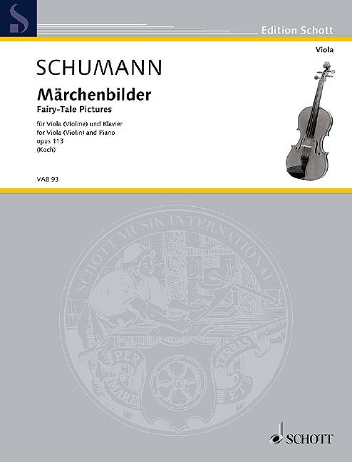 À l’été 1852 parurent chez l’éditeur Luckhardt à Kassel « Quatre Pièces » (Vier Stücke) de Robert Schumann, pour alto et piano, sous le titre de « Märchenbilder » (Images de contes), accompagnées d’une gravure de titre particulièrement expressive. Inhabituels étaient donc ici aussi bien ce titre de Märchenbilder, que la nomenclature de la pièce, avec alto solo. L’alto de ces Märchenbilder op. 113 de Schumann, dans un rôle de chambriste-soliste, fait entendre une sonorité relativement inhabituelle, mais d’autant plus séduisante. Instrumentation: viola (violin) and piano op. 113