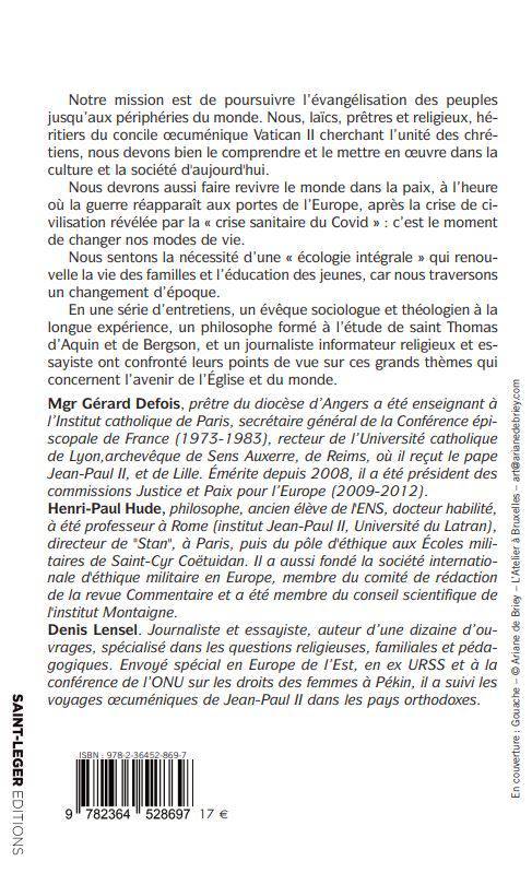Notre mission est de poursuivre l’évangélisation des peuples jusqu’aux périphéries du monde. Nous, laïcs, prêtres et religieux, héritiers du concile œcuménique Vatican II cherchant l’unité des chrétiens, nous devons bien le comprendre et le mettre en oeuvre dans la culture et la société d'aujourd'hui. Nous devrons aussi faire revivre le monde dans la paix, à l’heure où la guerre réapparaît aux portes de l’Europe, après la crise de civilisation révélée par la « crise sanitaire du Covid » : c’est le moment de changer nos modes de vie. Nous sentons la nécessité d’une « écologie intégrale » qui renouvelle la vie des familles et l’éducation des jeunes, car nous traversons un changement d’époque. En une série d’entretiens, un évêque sociologue et théologien à la longue expérience, un philosophe formé à l’étude de saint Thomas d’Aquin et de Bergson, et un journaliste informateur religieux et essayiste ont confronté leurs points de vue sur ces grands thèmes qui concernent l’avenir de l’Eglise