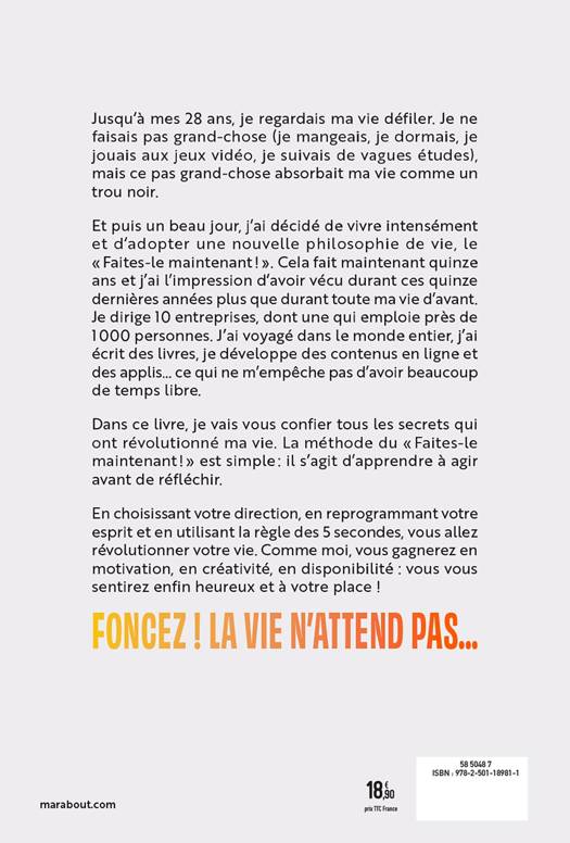 Dans ce livre, je vais vous confier tous les secrets qui ont révolutionné ma vie. La méthode du « Faites-le maintenant ! » est simple : il s’agit d’apprendre à agir avant de réfléchir. En choisissant votre direction, en reprogrammant votre esprit et en utilisant la règle des 5 secondes, vous allez révolutionner votre vie. Comme moi, vous gagnerez en motivation, en créativité, en disponibilité : vous vous sentirez enfin heureux et à votre place !
