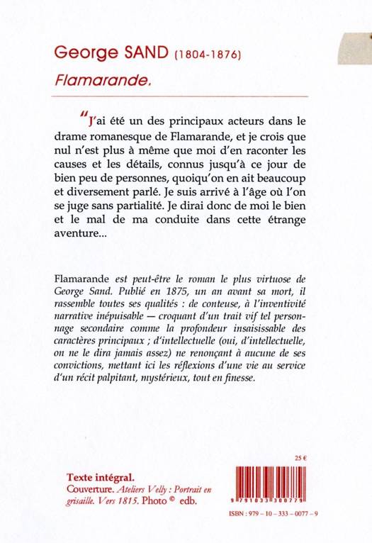 Flamarande est peut-être le roman le plus virtuose de George Sand. Publié en 1875, un an avant sa mort, il rassemble toutes ses qualités : de conteuse, à l'inventivité narrative inépuisable - croquant d'un trait vif tel personnage secondaire comme la profondeur insaisissable des caractères principaux ; d'intellectuelle (oui, d'intellectuelle, on ne le dira jamais assez) ne renonçant à aucune de ses convictions, mettant ici les réflexions d'une vie au service d'un récit palpitant, mystérieux, tout en finesse.