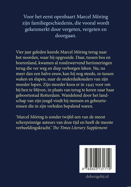Vier jaar geleden keerde Marcel Möring terug naar het noorden, waar hij opgroeide. Daar, tussen bos en boerenland, kwamen al rondzwervend herinneringen terug die ver weg en diep verborgen leken. Nu, na meer dan een halve eeuw, kan hij nog steeds, zo tussen waken en slapen, naar de onderduikouders van zijn moeder lopen. Zijn moeder had er in 1945 voor gekozen om bij hen te blijven, in plaats van terug te keren naar haar geboortestad Rotterdam. ‘Het is een plek waar ik graag kom, vanwege de warmte, de geur, de suggestie ook van een andere wereld, maar ik mag niets aanraken. Dat is een van de weinige verboden in het huis van mijn grootouders.’ In Familiewandeling duikt Marcel Möring, wandelend door het landschap van zijn jeugd, in het verleden en zoekt hij mensen en gebeurtenissen op die bepalend waren. Voor het eerst openbaart hij zijn familiegeschiedenis, die vooral wordt gekenmerkt door vergeten, vergeten en doorgaan.