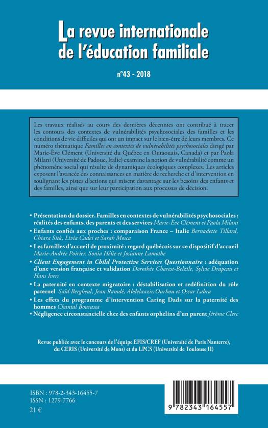 Les travaux réalisés au cours des dernières décennies ont contribué à tracer les contours des contextes de vulnérabilités psychosociales des familles et les conditions de vie difficiles qui ont un impact sur le bien-être de leurs membres. Ce numéro thématique Familles en contextes de vulnérabilités psychosociales dirigé par Marie-Ève Clément (Université du Québec en Outaouais, Canada) et par Paola Milani (Université de Padoue, Italie) examine la notion de vulnérabilité comme un phénomène social qui résulte de dynamiques écologiques complexes. Les articles exposent l'avancée des connaissances en matière de recherche et d'intervention en soulignant les pistes d'actions qui misent davantage sur les besoins des enfants et des familles, ainsi que sur leur participation aux processus de décision.
