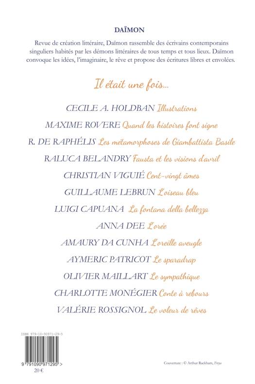 Daïmon a pour raison la transmission et le partage du savoir littéraire sous forme d'écriture, création, lecture, critique, représentation. Daïmon est une revue de création littéraire avec, au centre de son manifeste, une réflexion exigeante sur de l'art de la fiction. C'est un collectif d'auteurs et d'artiste dont les regards libres et singuliers invoquent les grandes figures littéraires, nos daïmôns. Daïmon revient avec un numéro 8 dédié aux contes, dont le titre formant une acrostiche parle de Fantaisies. Étrangetés. Espiègleries." Daïmon, une Fée ? Et pourquoi pas ! La Fée des contes tisse inlassablement ses histoires, sourde au temps qui passe. Dans le merveilleux et la frayeur, la bizarrerie et la curiosité, l'amusement et la coquinerie, il suffit de croire à l'incroyable pour la retrouver partout. Désirs, angoisses, rêves, tragédies petites ou grandes de l'existence, ordinaire mutin ou malicieux. Grâce aux contes porteurs de métaphores, de symboles, nous continuons, ici, une tradition qui ne s'éteindra jamais. Ainsi, Daïmon 8 et ses fées plongent dans la toute première forme de fiction qui nous a appris la passion des lettres et nourri l'imaginaire depuis toujours. Avec : Raluca Belandry, Maxime Rovere, Rémi de Raphélis, Amaury da Cunha, Aymeric Patricot, Cécile A. Holdban, Thierry Gillyboeuf, Charlotte Monégier, Guillaume Lebrun, Christian Viguié, Olivier Maillart, Valérie Rossignol, Anna Dee.