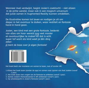 Het boek biedt vier manieren om samen te lezen, met of zonder AR: 1.Alleen het boek lezen (zonder de app) en samen naar sporen van Axel zoeken (vanaf 2 jaar). 2. Het boek lezen met vragen om de fantasie te prikkelen (vanaf 3 jaar). 3. Samen Josien’s fantasiewereld in AR verkennen (vanaf 2 jaar). 4. Op schattenjacht in Josien’s fantasie (vanaf 5 jaar).
