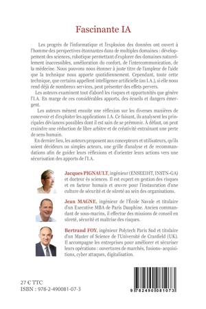 Les progrès de l'informatique et l'explosion des données ont ouvert à l'homme des perspectives étonnantes dans de multiples domaines : développement des sciences, robotique permettant d'explorer des domaines naturellement inaccessibles, amélioration du confort, de l'intercommunication, de la médecine. Nous pouvons nous étonner à juste titre de l'ampleur de l'aide que la technique nous apporte quotidiennement. Cependant, toute cette technique, que certains appellent intelligence artificielle (ou I.A.), si elle nous rend déjà de nombreux services, peut présenter des effets pervers. Les auteurs examinent tout d'abord les risques et opportunités que génère l'I.A. En marge de ces considérables apports, des écueils et dangers émergent. Les auteurs mènent ensuite une réflexion sur les diverses manières de concevoir et d'exploiter les applications I.A. Ce faisant, ils analysent les principales déviances possibles dont il est sain de se prémunir. À défaut, on peut craindre une réduction de libre arbitre et de créativité entraînant une perte de sens humain. En dernier lieu, les auteurs proposent aux concepteurs et utilisateurs, qu'ils soient décideurs ou simples acteurs, une grille d'analyse et de recommandations afin de guider leurs réflexions et d'orienter leurs actions vers une sécurisation des apports de l'I.A