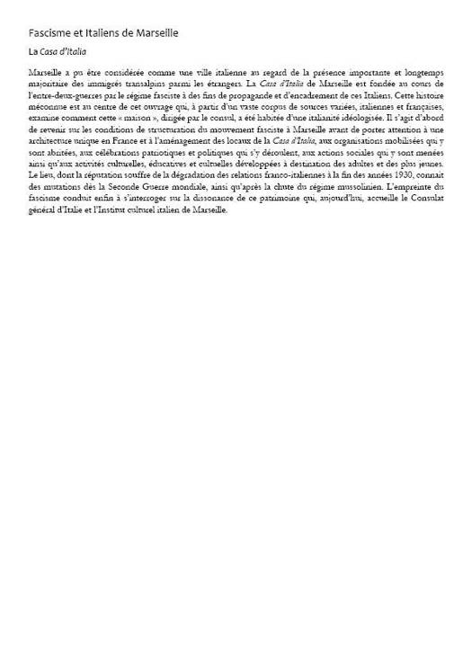 Ce livre ouvre les portes de la Casa d’Italia de Marseille afin de pénétrer dans les arcanes du fascisme italien. Il donne à voir et entendre la propagande menée par les chemises noires auprès de la plus importante communauté immigrée de la ville.