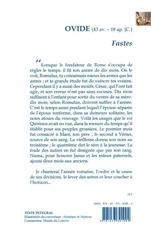 « Lorsque le fondateur de Rome s'occupa de régler le temps, il fit son année de dix mois. On le voit, Romulus, tu connaissais mieux les armes que les astres ; et ta grande étude fut de vaincre tes voisins. Cependant il y a aussi des motifs, César, qui l'ont fait agir, et son erreur n'est pas sans excuses. Dix mois suffisent à l'enfant pour sortir du ventre de sa mère : dix mois, selon Romulus, doivent suffire à l'année. C'est le temps aussi pendant lequel l'épouse séparée de l'époux renferme, dans sa demeure solitaire, les noirs atours du veuvage. Voilà les usages que le roi Quirinus avait en vue, dans la mesure du temps qu'il établit pour ses peuples grossiers. Le premier mois fut consacré à Mars, son père ; le second à Vénus, source de son sang. La vieillesse donna son nom au troisième ; le quatrième dut le sien à la jeunesse. La foule des autres ne fut désignée que par son rang. Numa, pour honorer Janus et les mânes paternels, ajouta deux mois aux anciens.