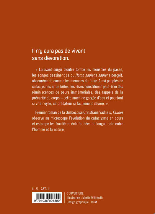Premier roman de la Québécoise Christiane Vadnais, Faunes observe au microscope l'évolution du cataclysme en cours et estompe les frontières échafaudées de longue date entre l'homme et la nature.