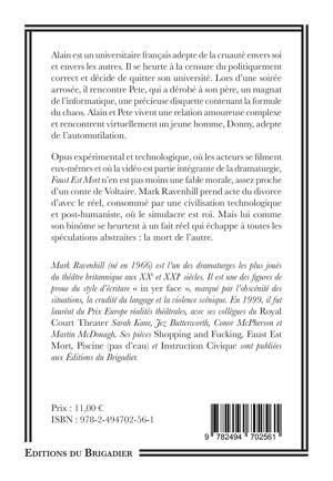 Opus expérimental et technologique, où les acteurs se filment eux-mêmes et où la vidéo est partie intégrante de la dramaturgie, Faust Est Mort n’en est pas moins une fable morale, assez proche d’un conte de Voltaire. Mark Ravenhill prend acte du divorce d’avec le réel, consommé par une civilisation technologique et post-humaniste, où le simulacre est roi. Mais lui comme son binôme se heurtent à un fait réel qui échappe à toutes les spéculations abstraites : la mort de l’autre.