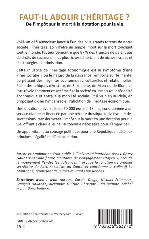 Voilà un défi audacieux lancé à l'un des plus grands totems de notre société l'héritage. Loin d'être un simple impôt sur la mort touchant tout le monde, l'auteur démontre que 87 % des Français ne paient pas de droits de succession, les plus riches bénéficiant de niches fiscales et de stratégies d'optimisation. Cette injustice de l'héritage économique est le symptôme d'une héritocratie où le hasard de la naissance l'emporte sur le mérite, perpétuant des inégalités économiques, culturelles et relationnelles. Riche des critiques d'Aristote, de Bakounine, de Marx ou de Blum, ce livre révèle comment ce système fige la société en une nouvelle féodalité économique et entrave la mobilité sociale. Et il va bien au-delà, en proposant d'oser l'impensable: l'abolition de l'héritage économique. Une dotation universelle de 50 000 euros à 18 ans, conditionnée à un service civique et financée par une refonte drastique de la fiscalité des successions, transformerait l'impôt sur la mort en une dotation pour la vie, offrant à chaque jeune l'autonomie nécessaire pour s'émanciper. Un appel vibrant au courage politique, pour une République fidèle aux principes d'égalité et d'émancipation.