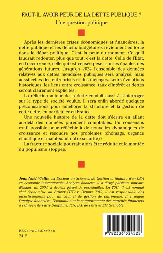 Après les dernières crises économiques et financières, la dette publique et les déficits budgétaires reviennent en force dans le débat politique. C'est la peur du moment. Ce qu'il faudrait redouter, plus que tout, c'est la dette. Celle de l'État, en l'occurrence, celle qui est censée peser sur les épaules des générations futures. Jusqu'en 2024 l'ensemble des données relatives aux dettes mondiales publiques sera analysé, mais aussi celles des entreprises et des ménages. Leurs évolutions historiques, les liens entre croissance, taux d'intérêt et dettes seront clairement explicités. La réflexion autour de la dette conduit aussi à s'interroger sur le type de société voulue. Il sera enfin abordé quelques préconisations pour améliorer la structure et la gestion de cette dette, en particulier en France. Une nouvelle histoire de la dette doit s'écrire en allant au-delà des données purement comptables. Un consensus est-il possible pour réfléchir à de nouvelles dynamiques de croissance et résoudre nos problèmes (chômage, urgence climatique et maintenant notre sécurité) ? La fracture sociale sera alors réduite, et la montée du populisme sera stoppée.
