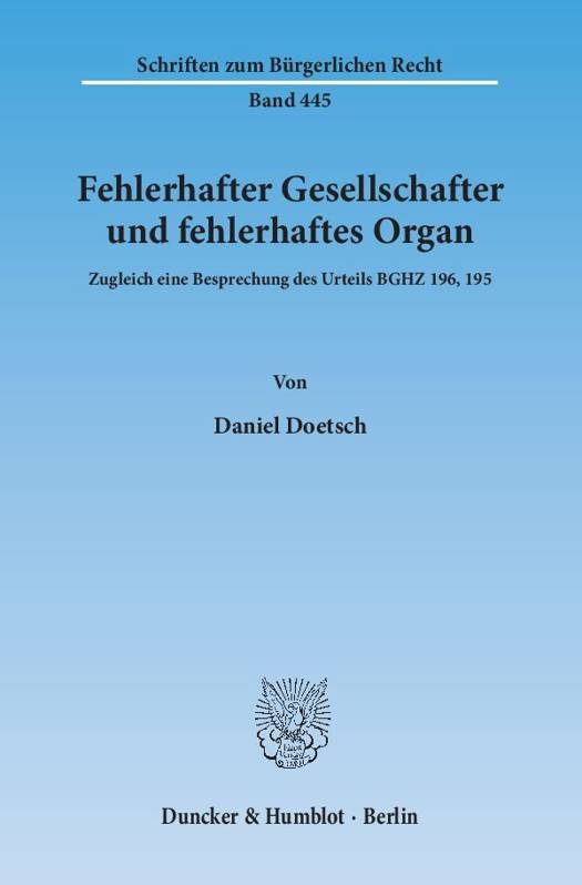 Daniel Doetsch untersucht den Zusammenhang beider Lehren zueinander, deckt Widersprüche und Ungenauigkeiten auf und stellt dann dar, dass beide Rechtsinstitute auf derselben Grundlage beruhen und auch dieselben Voraussetzungen haben. Nach einer Diskussion des zur fehlerhaften Aufsichtsratswahl ergangenen Urteils BGHZ 196, 195 zieht der Autor den Schluss, dass sämtliche Aussagen, die zu der einen Lehre getroffen werden, auch auf die andere Lehre übertragbar sind. Während sich die Rechtsprechung nicht durch Konsistenz, sondern zunehmend durch Einzelfallentscheidungen auszeichnet, schlägt der Autor ein stringentes und simples Anwendungskonzept vor.