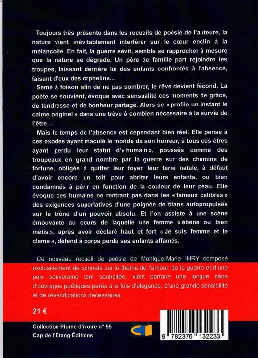 Ce nouveau recueil de poésie de Monique-Marie IHRY composé exclusivement de sonnets sur le thème de l’amour, de la guerre et d’une paix souveraine tant souhaitée, vient parfaire une longue série d’ouvrages poétiques, parés à la fois d’élégance, d’une grande sensibilité et de revendications nécessaires.