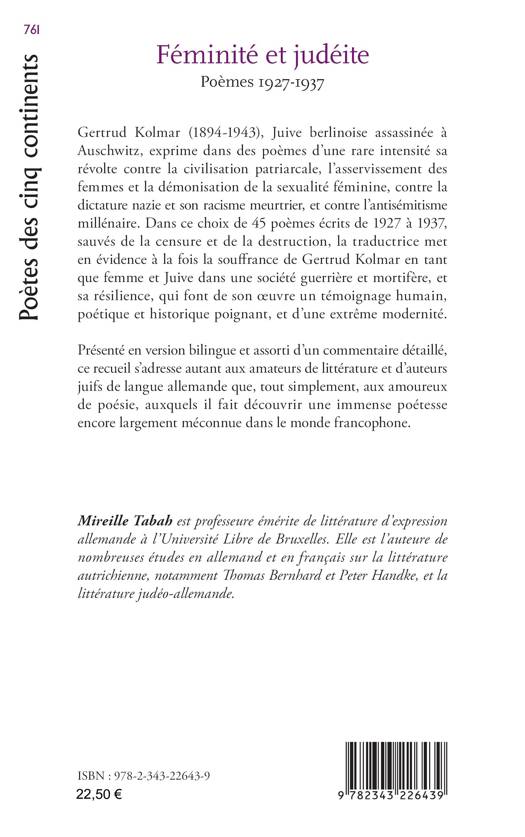 Gertrud Kolmar (1894-1943), Juive berlinoise assassinée à Auschwitz, exprime dans des poèmes d’une rare intensité sa révolte contre la civilisation patriarcale, l’asservissement des femmes et la démonisation de la sexualité féminine, contre la dictature nazie et son racisme meurtrier, et contre l’antisémitisme millénaire. Dans ce choix de 45 poèmes écrits de 1927 à 1937, sauvés de la censure et de la destruction, la traductrice met en évidence à la fois la souffrance de Gertrud Kolmar en tant que femme et Juive dans une société guerrière et mortifère, et sa résilience, qui font de son oeuvre un témoignage humain, poétique et historique poignant, et d’une extrême modernité.