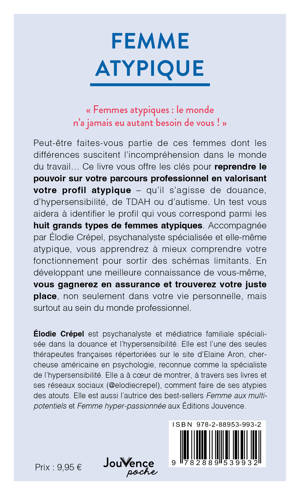 Peut-être faites-vous partie de ces femmes dont les différences suscitent l’incompréhension dans le monde du travail… Ce livre vous offre les clés pour reprendre le pouvoir sur votre parcours professionnel en valorisant votre profil atypique – qu’il s’agisse de douance, d’hypersensibilité, de TDAH ou d’autisme. Un test vous aidera à identifier le profil qui vous correspond parmi les huit grands types de femmes atypiques. Accompagnée par Élodie Crépel, psychanalyste spécialisée et elle-même atypique, vous apprendrez à mieux comprendre votre fonctionnement pour sortir des schémas limitants. En développant une meilleure connaissance de vous-même, vous gagnerez en assurance et trouverez votre juste place, non seulement dans votre vie personnelle, mais surtout au sein du monde professionnel.