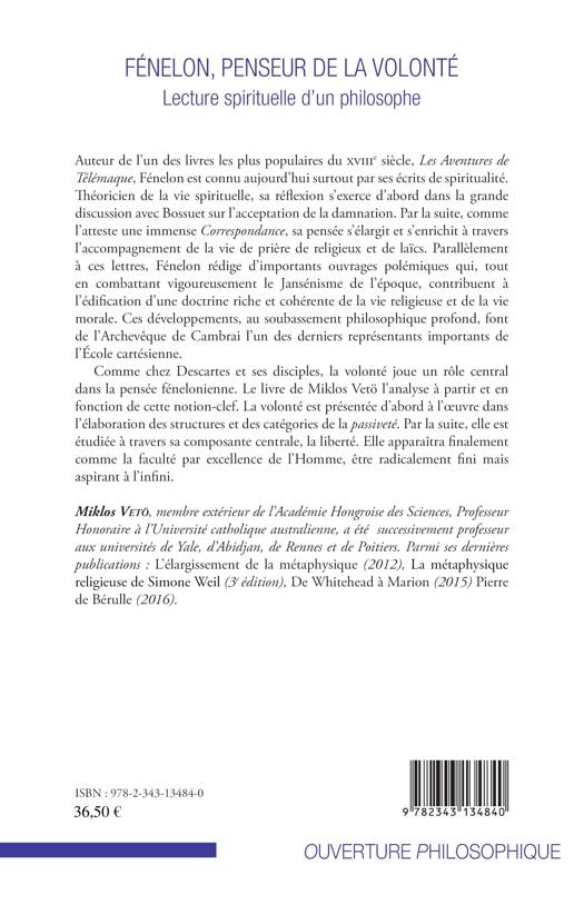 Fénelon est connu aujourd'hui surtout par ses écrits de spiritualité. La volonté joue aussi un rôle central dans la pensée fénelonienne. Le livre de Miklos Vetö l'analyse à partir de cette notion-clef - la volonté. Elle apparaît finalement comme la faculté par excellence de l'Homme, être radicalement fini mais aspirant à l'infini.