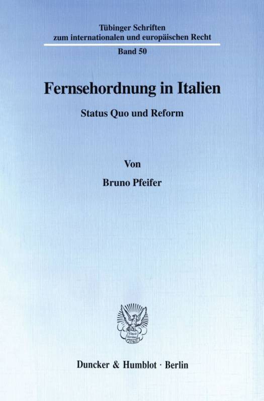 Der Autor hat es sich zur Aufgabe gemacht, die bisherige Entwicklung der Fernsehordnung Italiens nachzuzeichnen und die derzeit gültigen Regelungen darzustellen und kritisch zu beleuchten. Besonderes Augenmerk gilt dabei den vom Verfassungsgerichtshof für eine Reform der Fernsehordnung gemachten Vorgaben. Neben den dringendsten Problemen im Bereich des öffentlichen Fernsehens (Aufgabe des öffentlichen Fernsehens im dualen System, Gesellschaftsstruktur der RAI, öffentliche Rundfunkfinanzierung, Privatisierung) befaßt sich Bruno Pfeifer auch mit dem privaten Rundfunksektor und der hier vordringlichsten Aufgabe der Sicherung einer pluralistischen Fernsehlandschaft.