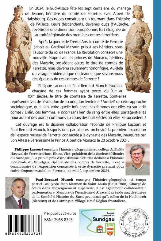 En 2024, le Sud-Alsace fête les sept cents ans du mariage de Jeanne, héritière du comté de Ferrette, avec Albert de Habsbourg. Ces noces constituent un tournant dans l’histoire de l’Alsace. Leurs descendants, devenus ducs d’Autriche, revêtiront une dimension européenne, fort éloignée de l’autorité régionale des premiers comtes ferrettiens. Après la guerre de Trente Ans, le comté de Ferrette échoit au Cardinal Mazarin puis à ses héritiers, sous l’autorité du roi de France. La Révolution consacre une nouvelle étape avec les princes de Monaco, héritiers des Mazarin, possédant certes le titre de comtes de Ferrette, mais devenu seulement honorifique. Au-delà du visage emblématique de Jeanne, que savons-nous des épouses de ces comtes de Ferrette ? Philippe Lacourt et Paul-Bernard Munch étudient chacune de ces femmes ayant porté, du XIIe au XXIe siècles, le titre de comtesse de Ferrette. Sont-elles représentatives de l’évolution de la condition féminine ? Au-delà de cette approche sociologique, quel lien, voire quelle influence, ces femmes ont-elles eu sur ledit comté ? Enfin, ces femmes, a priori sans lien de sang entre elles, partagent-elles pour autant des points communs au cours des huit siècles où elles se succèdent ? Cet ouvrage est la dixième collaboration féconde de Philippe Lacourt et Paul-Bernard Munch, lesquels ont, par ailleurs, orchestré la première exposition de l’espace muséal de Ferrette, consacrée à la dynastie des Mazarin, inaugurée par Son Altesse Sérénissime le Prince Albert de Monaco le 20 octobre 2021.