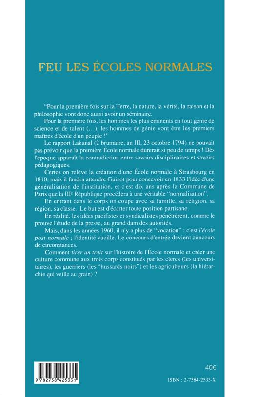 "Pour la première fois sur la Terre, la nature, la vérité, la raison et la philosophie vont donc aussi avoir un séminaire. Pour la première fois, les hommes les plus éminents en tout genre de science et de talent les hommes de génie vont être les premiers maîtres d'école d'un peuple Le rapport Lakanal (2 brumaire, an III, 23 octobre 1794) ne pouvait pas prévoir que la première Ecole normale durerait si peu de temps ! Dès l'époque apparait la contradiction entre savoirs disciplinaires et savoirs pédagogiques. Certes on relève la création d'une École normale à Strasbourg en 1810, mais il faudra attendre Guizot pour concevoir en 1833 1'idée d'une généralisation de l'institution, et c'est dix ans après la Commune de Paris que la Ille République procédera à une véritable ••normalisation" En entrant dans le corps on coupe avec sa famille, sa religion, sa région, sa classe. Le but est d'écarter toute position partisane. En réalité. les idées pacifistes et syndicalistes pénétrèrent, comme le prouve l'étude de la presse, au grand dam des autorités. Mais. dans les années 1960, il n'y a plus de '"vocation" : c'est l'école post-normale ; l'identité vacille. Le concours d'entrée devient concours de circonstances. Comment tirer un trait sur l'histoire de l'École normale et créer une culture commune aux trois corps constitués par les clercs (les universitaires). les guerriers (les "hussards noirs") et les agriculteurs (la hiérarchie qui veille au grain) ?