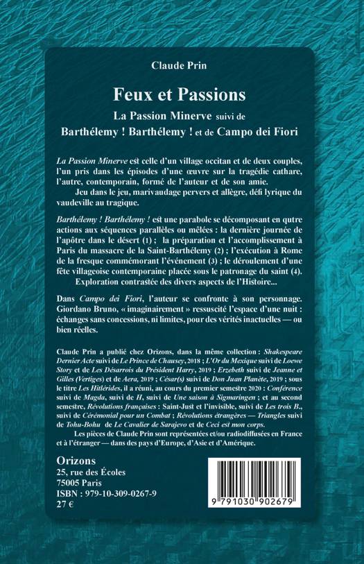 La Passion Minerve est celle d'un village occitan et de deux couples, l'un pris dans les épisodes d'une uvre sur la tragédie cathare, l'autre, contemporain, formé de l'auteur et de son amie. Barthélemy ! Barthélemy ! est une parabole se décomposant en quatre actions aux séquences parallèles ou mêlées : notamment la préparation et l'accomplissement à Paris du massacre de la Saint-Barthélemy. Dans Campo dei Fiori, l'auteur se confronte à son personnage. Giordano Bruno, « imaginairement » ressuscité l'espace d'une nuit : échanges sans concessions, ni limites, pour des vérités inactuelles ou bien réelles.