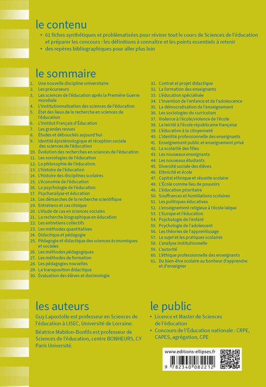 61 fiches synthétiques et problématisées pour réviser tout le cours de Sciences de l’éducation et préparer les concours :