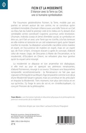 Par l’oxymore géokinétisme ficinien, la Terre, mobile par ses parties se serrant autour de son centre, ne se constitue qu’en semblant immobile. L’humain s’élance avec une telle Terre en un Ciel où Dieu fait du Soleil le premier créé et le milieu en l’y dotant d’un semblable centre constitutif. Copernic accentue cette révolution. L’humain, individu (corps et âme) d’emblée social, se symbolise en être un, car il fait un avec une Terre qui ne s’unifie, à la fois terreuse en elle-même et terrestre en un ciel solairement igné, qu’en faisant s’unifier le monde. Sa dilatation universelle s’accélère entre matière et esprit, en l’occurrence de matière en esprit, mais en un esprit qui, de Ficin à Kant, s’instaure d’avant à après le concept, d’abord celui de masse. L’ego, de Descartes à Marie de l’Incarnation, et la modernité, d’Occident en Orient, ne refoulent plus leur genèse qu’en la voyant ainsi resurgir. La modernité se dépasse et son anamnèse est dialogique, si elle met au jour et aperçoit ses prémices renaissantes, d’abord ficiniennes, resurgir à sa source. S’instaure une biasymétrie temporelle sociohistoricisante : la Renaissance ne fait pas que s’ajouter à l’Antiquité et au Moyen-Âge (et paraître comme si en deçà d’une Modernité faisant rupture), mais se constitue en les articulant et impulse la Modernité. Tiers moment, non plus tant exclus et en sus qu’inclus. S’y forge le sens de soi et, en s’intellectualisant, s’y conçoit l’histoire de la philosophie.
