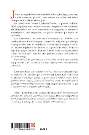 Jeune au regard de la science et de la philosophie, la psychanalyse a neanmoins un passe et, plus encore, un present fait d'une pratique et d'horizons theoriques. De l'analyse de l'adulte a celle de l'enfant, la pensee de Freud (1856-1939) montre sa force inventive et sa capacite d'evolution face aux difficultes et aux questionnements qui surgissent de la relation analytique et, plus largement, des grands seismes politiques du XXe siecle. Les entretiens presents ne s'adressent pas d'abord aux psychanalystes. En interrogeant la reflexion et la pratique clinique d'une psychanalyste en exercice, ils s'efforcent d'indiquer le travail de l'analyse a qui n'est pas familier de la pensee de Freud. Ils disent, dans une langue ouverte, l'histoire et la diversite des enjeux d'une oeuvre qui demeure l'une des plus grandes affaires intellectuelles de notre temps. Faire droit a la psychanalyse, c'est faire droit a une maniere complexe de voir l'individu et a une maniere de voir autrement le monde.