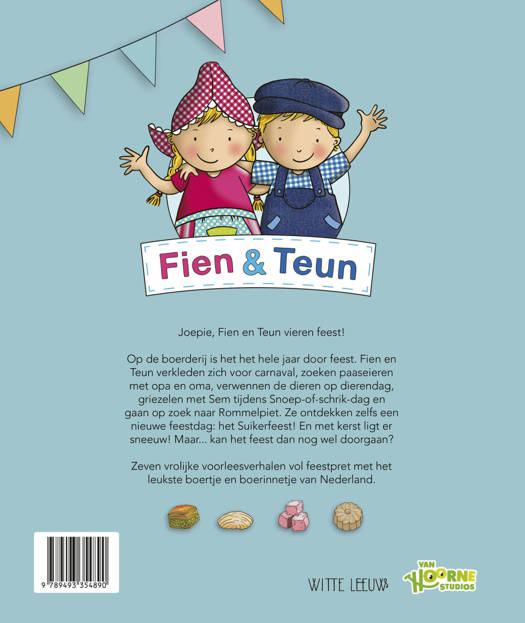 In Fien & Teun vieren feest lees je voorleesverhalen over het leukste boertje en boerinnetje van Nederland! In deze bundel met vrolijke, herkenbare verhalen vol kleur en gezelligheid vieren Fien & Teun de bekendste feesten die in Nederland door kinderen worden gevierd. Ze verkleden zich met carnaval, zoeken naar paaseieren, verwennen de dieren op dierendag, gaan langs de deuren met Halloween, zetten hun schoen met Sinterklaas en nog veel meer. En als een klasgenootje ze uitnodigt voor het Suikerfeest ontdekken ze ook een nieuwe feestdag.