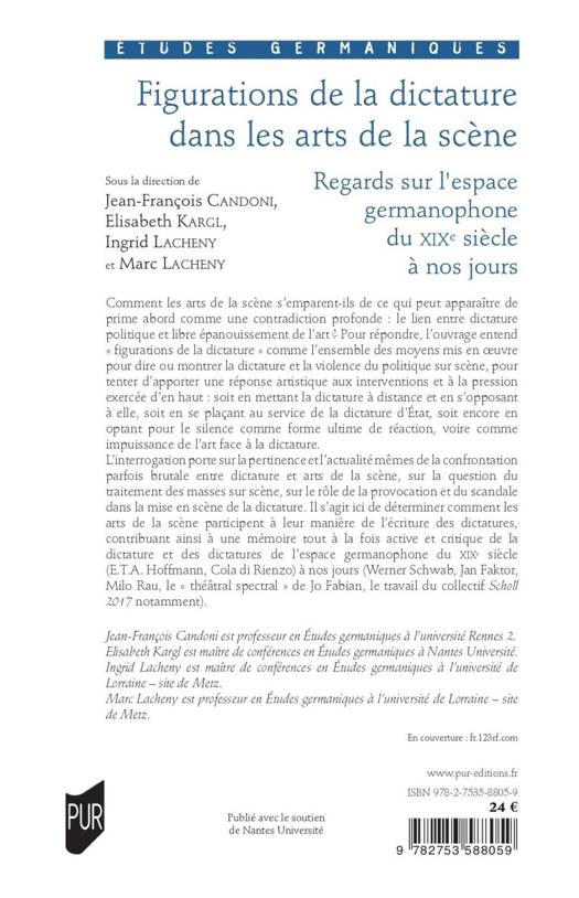 L’interrogation porte sur la pertinence et l’actualité mêmes de la confrontation parfois brutale entre dictature et arts de la scène, sur la question du traitement des masses sur scène, sur le rôle de la provocation et du scandale dans la mise en scène de la dictature. Il s’agit ici de déterminer comment les arts de la scène participent à leur manière de l’écriture des dictatures, contribuant ainsi à une mémoire tout à la fois active et critique de la dictature et des dictatures de l’espace germanophone du XIXe siècle (E.T.A. Hoffmann, Cola di Rienzo) à nos jours (Werner Schwab, Jan Faktor, Milo Rau, le « théâtral spectral » de Jo Fabian, le travail du collectif Scholl 2017 notamment).