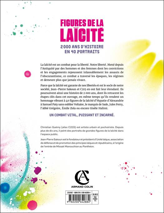 Parce que la laïcité est garante de nos libertés et est le socle de notre société, Jean-Pierre Sakoun et C215 en ont fait leur étendard. Ils poursuivent ainsi une histoire de 2 000 ans, dont ils retracent les étapes clés dans cet ouvrage, en même temps qu'ils rendent un hommage vibrant à 40 figures de la laïcité d'Hypatie d'Alexandrie à Samuel Paty sans oublier Voltaire, le marquis de Sade, Jules Ferry, l'abbé Grégoire, Émile Zola ou encore Gisèle Halimi.