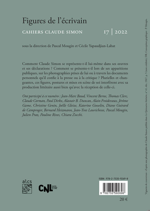 C omment Claude Simon se représente-t-il lui-même dans ses oeuvres et ses déclarations ? Comment se présente-t-il lors de ses apparitions publiques, sur les photographies prises de lui ou à travers les documents personnels qu’il confie à la presse ou à la critique ? Plurielles et changeantes, ces figures, postures et mises en scène de soi interfèrent avec sa production littéraire aussi bien qu’avec la réception de celle-ci.