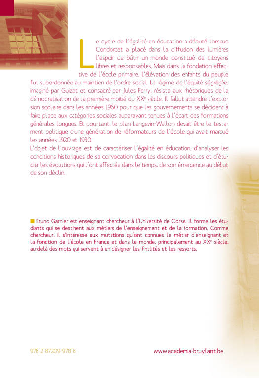 L'objet de l'ouvrage est de caractériser l'égalité en éducation et d'analyser les conditions de sa convocation dans les discours. Le cycle de l'égalité, qui débuta avec l'espoir placé par Condorcet dans la diffusion universelle des lumières, a duré deux siècles. Le régime de l'équité ségrégée, imaginé par Guizot et consacré par Jules Ferry, en constitua une modalité paradoxale, qui résista aux critiques de plusieurs générations de réformateurs. Le plan Langevin-Wallon, qui aurait dû couronner leurs efforts, fut leur testament politique.