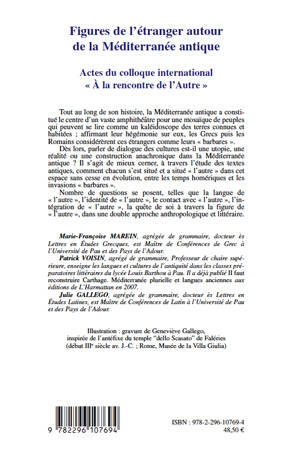 Parler de dialogue des cultures est-il une utopie, une réalité ou une construction anachronique dans la Méditerranée antique ? Il s'agit de mieux cerner, à travers l'étude des textes antiques, comment chacun s'est situé et a situé "l'autre" dans cet espace sans cesse en évolution, tour à tour dominé par les Grecs puis par les Romains, qui considérèrent les peuples dominés comme leurs "barbares". On s'interrogera sur la langue de "l'autre", l'identité de "l'autre", le contact avec "l'autre", l'intégration de "l'autre"...