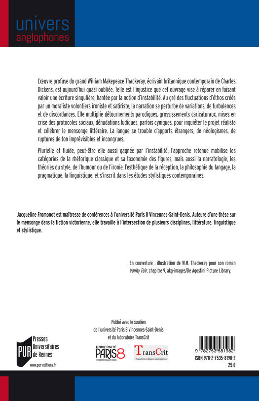 Cet ouvrage fait valoir l’écriture singulière de William Makepeace Thackeray, hantée par la notion d’instabilité. Au gré des fluctuations d’éthos créés par un moraliste volontiers ironiste et satiriste, la narration se perturbe de variations, de turbulences et de discordances. La langue se trouble d’apports étrangers, de néologismes, de ruptures de ton imprévisibles et incongrues. Plurielle et fluide, l’approche retenue ici mobilise les catégories de la rhétorique classique et sa taxonomie des figures, mais aussi la narratologie, les théories du style, de l’humour ou de l’ironie, l’esthétique de la réception, la philosophie du langage, la pragmatique, la linguistique, et s’inscrit dans les études stylistiques contemporaines.