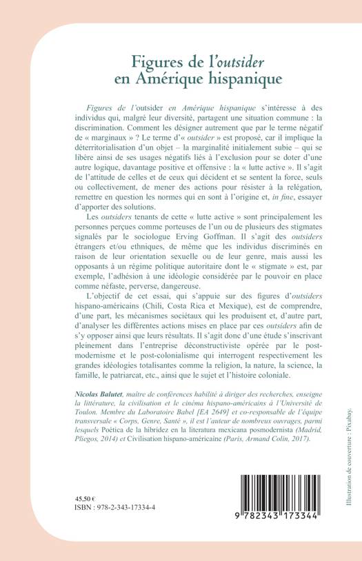 L'objectif de cet essai, qui s'appuie sur des figures d'outsiders hispano-américains (Chili, Costa Rica et Mexique), est de comprendre, d'une part, les mécanismes sociétaux qui les produisent et, d'autre part, d'analyser les différentes actions mises en place par ces outsiders afin de s'y opposer ainsi que leurs résultats. Il s'agit donc d'une étude s'inscrivant pleinement dans l'entreprise déconstructiviste opérée par le postmodernisme et le post-colonialisme qui interrogent respectivement les grandes idéologies totalisantes comme la religion, la nature, la science, la famille, le patriarcat, etc.