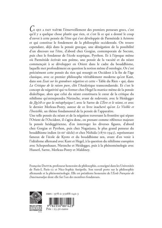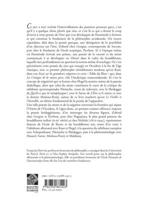 Ce qui a fait naitre l'emerveillement des premiers penseurs grecs, c'est qu'il y a quelque chose plutot que rien, et c'est la ce qui a donne le coup d'envoi a cette pensee de l'etre qui s'est developpee de Parmenide a Aristote et qui constitue le fondement de la philosophie occidentale. On trouve cependant, deja dans la pensee grecque, une denegation de la possibilite d'un discours sur l'etre, d'abord chez Gorgias, contemporain de Socrate, puis chez le fondateur de l'ecole sceptique, Pyrrhon. Et a l'epoque meme ou Parmenide ecrivait son poeme, une pensee de la vacuite et du neant commencait a se developper en Orient dans le cadre du bouddhisme, laquelle met profondement en question la notion meme d'ontologie. Or c'est precisement cette pensee du rien qui resurgit en Occident a la fin de l'age classique, avec ce premier philosophe veritablement moderne qu'est Kant, dans son Essai sur les grandeurs negatives et cette Table du Rien qui, dans La Critique de la raison pure, clot l'Analytique transcendantale. Et c'est le concept de negativite qui va former chez Hegel la matrice meme de la pensee dialectique, alors que celui du neant constituera le coeur de la critique du nihilisme qu'entreprendra Nietzsche, avant de redevenir, avec le Heidegger de Qu'est-ce que la metaphysique ?, avec le Sartre de L'Etre et le neant, et avec le dernier Merleau-Ponty, auteur de ce livre inacheve qu'est Le Visible et l'Invisible, un theme fondamental de la pensee de l'apparaitre. Une telle pensee du neant et de la negation traversant la frontiere qui separe l'Orient de l'Occident, il s'agira donc, en prenant comme reference majeure la pensee heideggerienne, d'en interroger les diverses figures, d'abord chez Gorgias et Pyrrhon, puis chez Nagarjuna, le plus grand penseur du bouddhisme indien (ii-iiie siecle) et chez Nishida (1870-1945), representant fameux de l'ecole de Kyoto et du bouddhisme zen, avant d'en venir a l'idealisme allemand avec Kant et Hegel, a la question du nihilisme europeen avec Schopenhauer, Nietzsche et Heidegger, puis a la phenomenologie avec Husserl, Sartre, Merleau-Ponty et Maldiney.