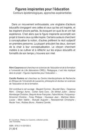 Dans un mouvement enthousiaste, une vingtaine d'acteurs éducatifs s'engagent vers celles et ceux qui les ont inspirés, et les inspirent encore parfois. Ils évoquent en quoi ils en ont fait expérience. C'est alors que la figure inspirante accomplit son projet à travers ceux qu'elle inspire. Certains auteurs cherchent à conceptualiser la notion, d'autres préfèrent le récit subjectif en première personne. La plupart articulent les deux, donnant de la chair à leur conceptualisation. Le citoyen cherchant matière à se cultiver et à réfléchir sur les enjeux éducatifs et formatifs de son temps y trouvera son miel.