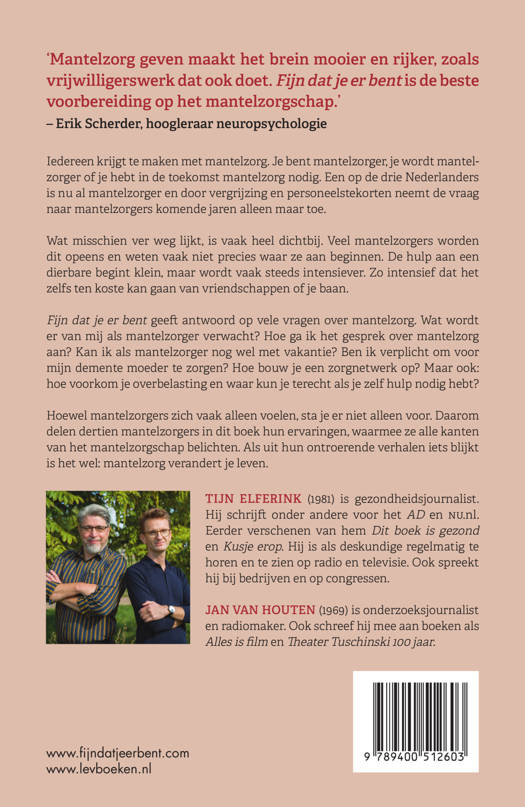 Fijn dat je er bent geeft antwoord op vele vragen over mantelzorg. Wat wordt er van mij als mantelzorger verwacht? Hoe ga ik het gesprek over mantelzorg aan? Kan ik als mantelzorger nog wel met vakantie? Ben ik verplicht om voor mijn demente moeder te zorgen? Hoe bouw je een zorgnetwerk op? Maar ook: hoe voorkom je overbelasting en waar kun je terecht als je zelf hulp nodig hebt?