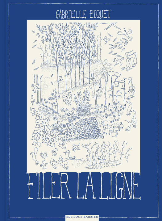 De dessin en dessin, sans autre fil qu’une chute, un paysage habité, un portrait d’intérieur, Gabrielle Piquet nous enjoint à ‘filer la ligne’. Elle nous invite, avec la délicatesse et l’humour qui la caractérisent, à la suivre tout au long d’un chemin délicieusement sinueux où chaque dessin se boucle mais où le trait, toujours, se poursuit. Entre le blanc et le plein, le dessin et le texte, le dit et le non-dit, elle déroule ses lignes au travers d’un peu plus de 70 compositions libres et inédites. Nous voici pris d’un vertige amusé, suspendus, au bord de chaque page, sur ce fil invisible qu’elle tient parfaitement : après ses albums, elle inaugure avec cet ouvrage un nouvel exercice, celui du dessin libre, où son ton si particulier s’exprime à merveille.