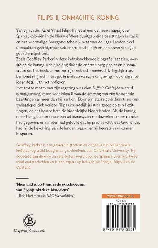 'Filips II' van Geoffrey Parker is een unieke biografie van deze Spaanse vorst. Filips II erfde van zijn vader Karel V niet alleen een wereldrijk, maar ook enorme schulden en lichamelijke en geestelijke gebreken door zijn Habsburgse afkomst (zijn ouders waren neef en nicht). Filips bracht zijn regeerperiode vooral door achter zijn bureau, waar hij tot diep in de nacht dossiers bestudeerde en brieven schreef. Door zijn obsessie met details en neiging het heft in eigen handen te willen houden, verdronk hij in de bureaucratie van zijn rijk. 'Filips II' van gelauwerd historicus Geoffrey Parker is een uitmuntende biografie op basis van uniek bronnenmateriaal.