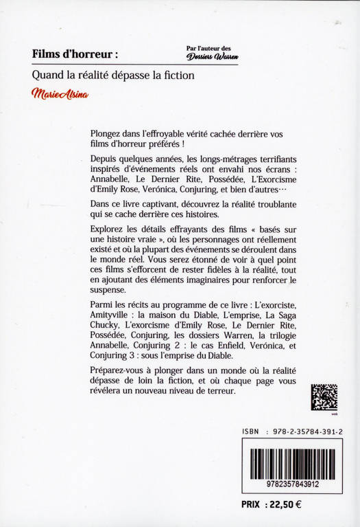 Plongez dans l'effroyable vérité cachée derrière vos films d'horreur préférés ! Depuis quelques années, les longs-métrages terrifiants inspirés d'événements réels ont envahi nos écrans : Annabelle, Le Dernier Rite, Possédée, L'Exorcisme d'Emily Rose, Verónica, Conjuring, et bien d'autres… Dans ce livre captivant, découvrez la réalité troublante qui se cache derrière ces histoires. Explorez les détails effrayants des films « basés sur une histoire vraie », où les personnages ont réellement existé et où la plupart des événements se déroulent dans le monde réel. Vous serez étonné de voir à quel point ces films s'efforcent de rester fidèles à la réalité, tout en ajoutant des éléments imaginaires pour renforcer le suspense. Parmi les récits au programme de ce livre : L'exorciste, Amityville : la maison du Diable, L'emprise, La Saga Chucky, L'exorcisme d'Emily Rose, Le Dernier Rite, Possédée, Conjuring, les dossiers Warren, la trilogie Annabelle, Conjuring 2 : le cas Enfield, Verónica, et Conjuring 3 : sous l'emprise du diable. Préparez-vous à plonger dans un monde où la réalité dépasse de loin la fiction, et où chaque page vous révélera un nouveau niveau de terreur.
