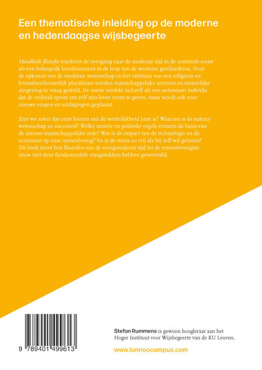Handboek filosofie markeert de overgang naar de moderne tijd in de zestiende eeuw als een belangrijk breukmoment in de loop van de westerse geschiedenis. Door de opkomst van de moderne wetenschap en het ontstaan van een religieus en levensbeschouwelijk pluralisme worden maatschappelijke normen en menselijke zingeving in vraag gesteld. De mens ontdekt zichzelf als een autonoom individu dat de vrijheid opeist om zelf zijn leven vorm te geven, maar wordt ook voor nieuwe vragen en uitdagingen geplaatst. Zijn we zeker dat onze kennis van de werkelijkheid juist is? Waarom is de natuurwetenschap zo succesvol? Welke morele en politieke regels vormen de basis van de nieuwe maatschappelijke orde? Wat is de impact van de technologie en de economie op onze samenleving? En is de mens zo vrij als hij zelf wil geloven? Dit boek toont hoe filosofen van de vroegmoderne tijd tot de eenentwintigste eeuw met deze fundamentele vraagstukken hebben geworsteld.