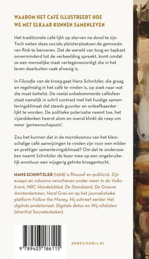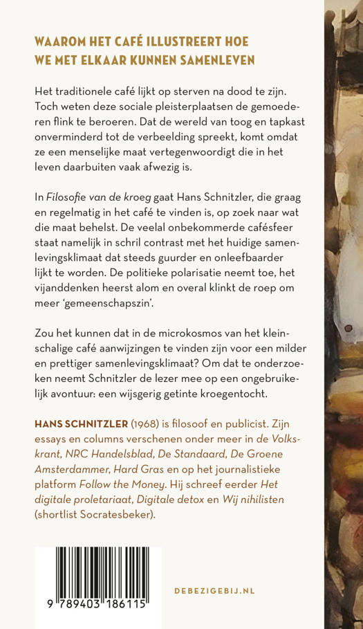 In Filosofie van de kroeg gaat Hans Schnitzler, die graag en regelmatig in het café te vinden is, op zoek naar wat die maat behelst. De veelal onbekommerde cafésfeer staat namelijk in schril contrast met een samenlevingsklimaat dat steeds guurder en onleefbaarder lijkt te worden. De politieke polarisatie neemt toe, het vijanddenken heerst alom en overal klinkt de roep om meer ‘gemeenschapszin’.