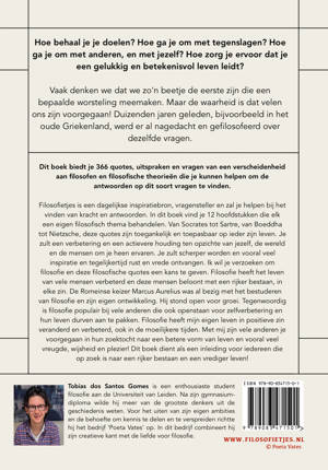 Filosofietjes is een dagelijkse inspiratiebron, vragensteller en zal je helpen bij het vinden van kracht en antwoorden. In dit boek vind je 12 hoofdstukken die elk een eigen filosofisch thema behandelen. Van Socrates tot Sartre, van Boeddha tot Nietzsche, deze quotes zijn toegankelijk en toepasbaar op ieder zijn leven. Je zult een verbetering en een actievere houding ten opzichte van jezelf, de wereld en de mensen om je heen ervaren. Je zult scherper worden en vooral veel inspiratie en tegelijkertijd rust en vrede ontvangen. Ik wil je verzoeken om filosofie en deze filosofische quotes een kans te geven. Filosofie heeft het leven van vele mensen verbeterd en deze mensen beloont met een rijker bestaan, in elke zin. De Romeinse keizer Marcus Aurelius was al bezig met het bestuderen van filosofie en zijn eigen ontwikkeling. Hij stond open voor groei. Tegenwoordig is filosofie populair bij vele anderen die ook openstaan voor zelfverbetering en hun leven durven aan te pakken. Filosofie heeft mijn eigen leven in positieve zin veranderd en verbeterd, ook in de moeilijkere tijden. Met mij zijn vele anderen je voorgegaan in hun zoektocht naar een betere vorm van leven en vooral veel vreugde, wijsheid en plezier! Dit boek dient als een inleiding voor iedereen die op zoek is naar een rijker bestaan en een vrediger leven!